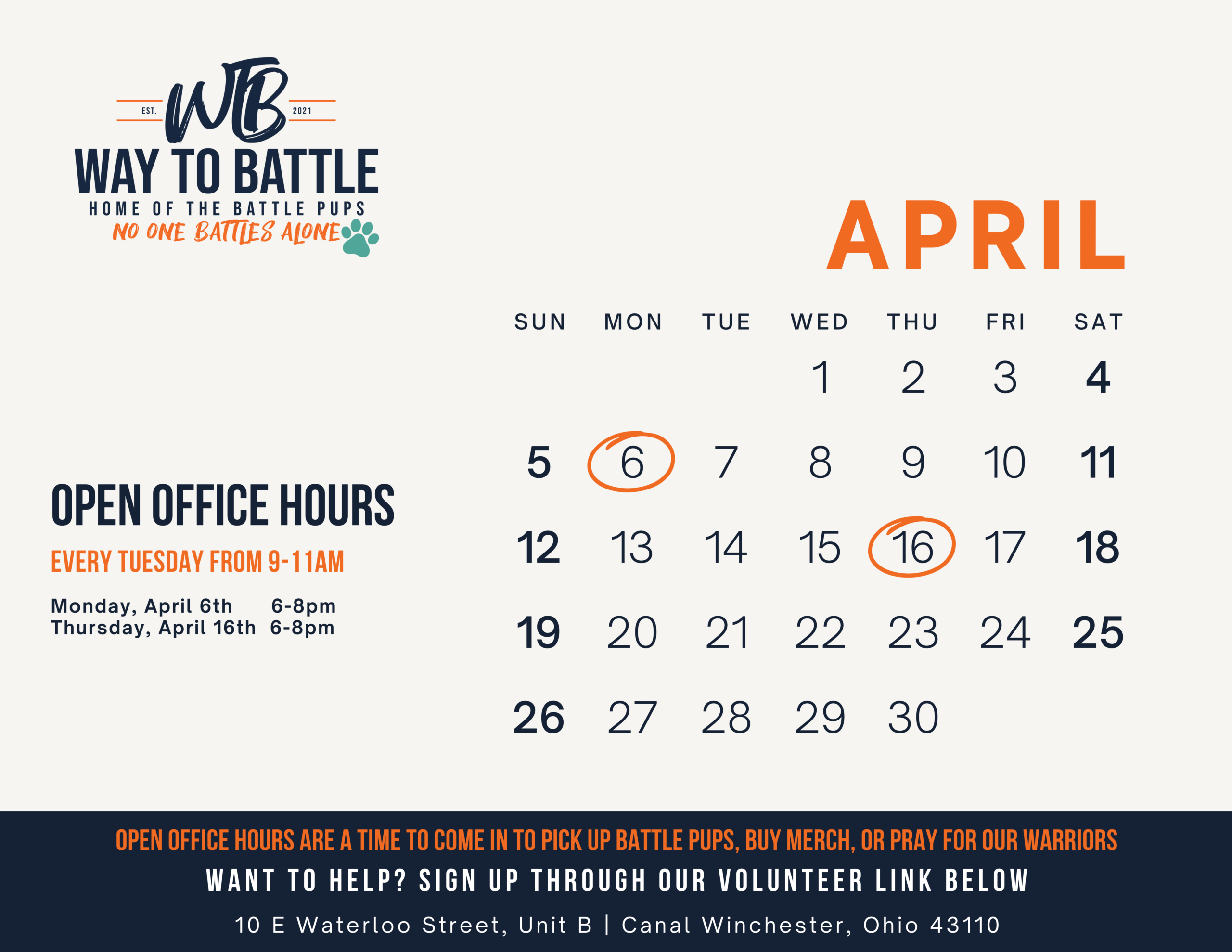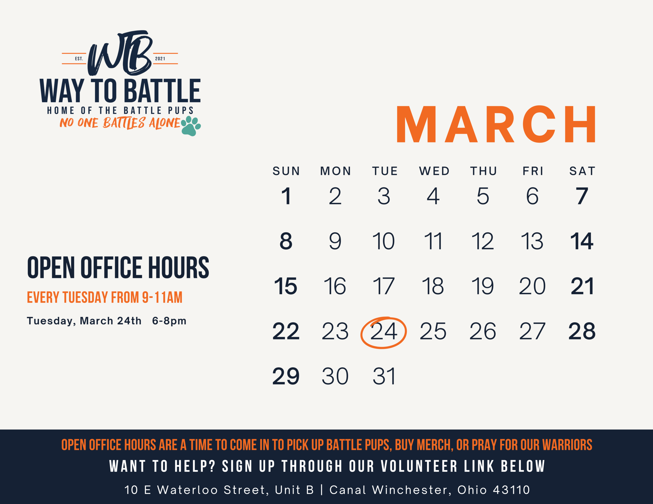 If you’d like to volunteer with us, there are sign up sheets below for each month. If all of the slots are full or if you have a larger group or corporate volunteer event you’d like to discuss, you can email us at BattlePups@WayToBattle.com.
